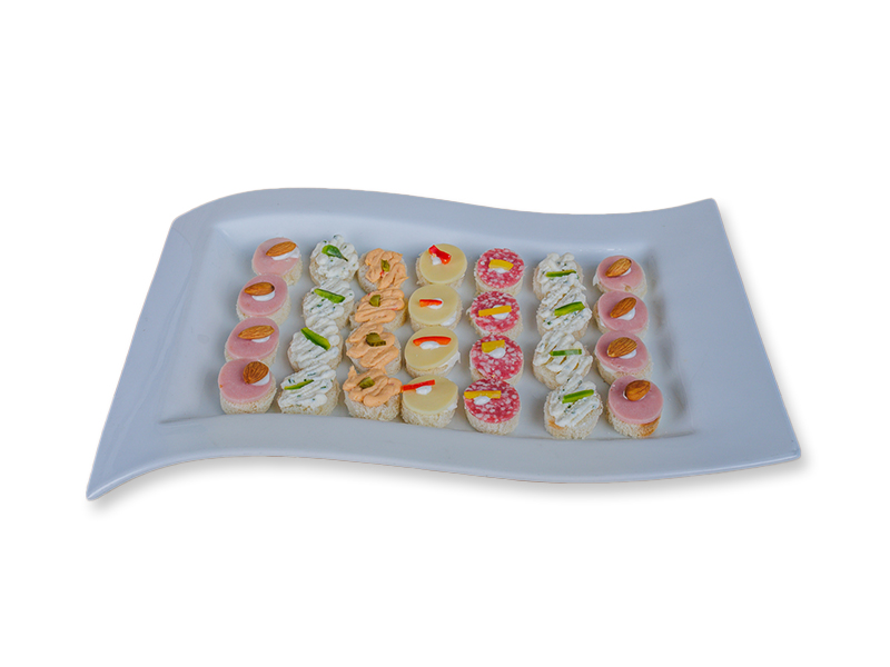 bocado en pan miga; jamon / almendra, queso, salame, ave morrón,quesillo ciboulette.