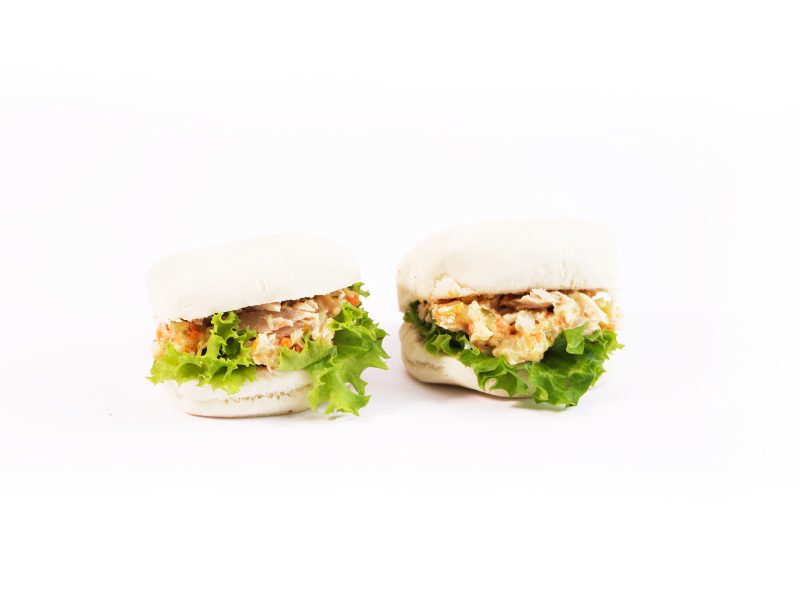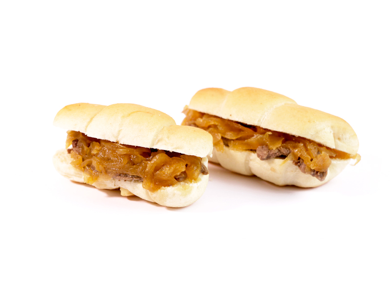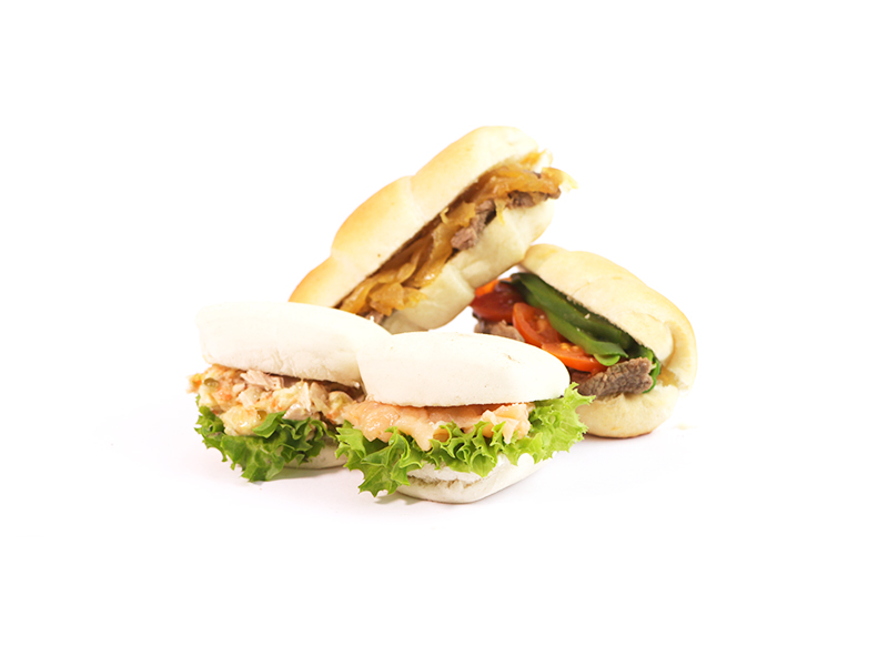 Pan hoja relleno con carne salteada, porotos verdes, tomate cherry; y rellenos con carne salteada con cebolla caramelizada.