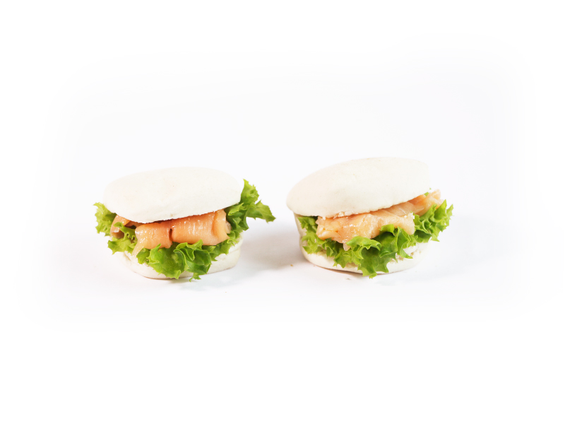 Pan chapata con queso crema nuez con ciboulette, lechuga, salmón ahumado; y pasta tártara de atún con lechuga.