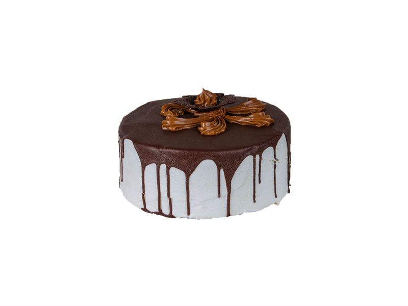 Bizcocho blanco y chocolate, manjar, mermelada de frambuesa y crema pastelera. Cubierta con crema chantilly y cobertura de chocolate.