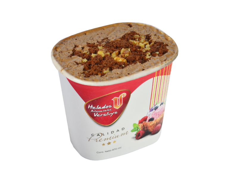 Helado de leche y crema de chocolate con trocitos de brownie, nuez y manjar.