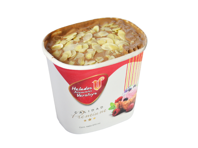 Helado de leche y crema de chocolate con trocitos de almendras.