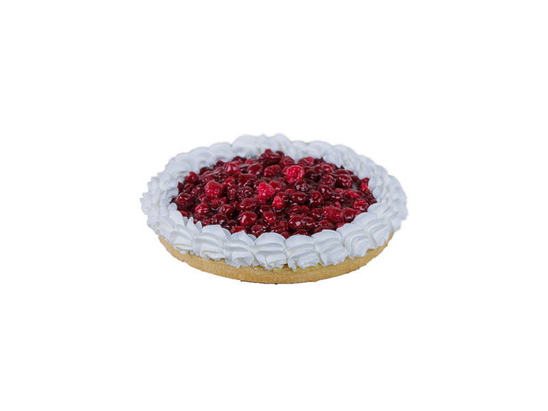 Masa alemana con frambuesas naturales y crema vainilla, adornado con crema chantilly.