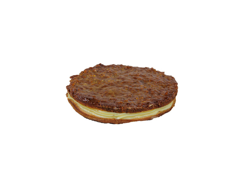 Base de masa dulce con relleno de crema mousseline, cubierto en pasta de miel con nuez