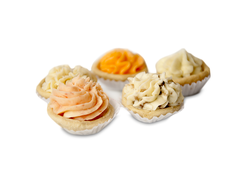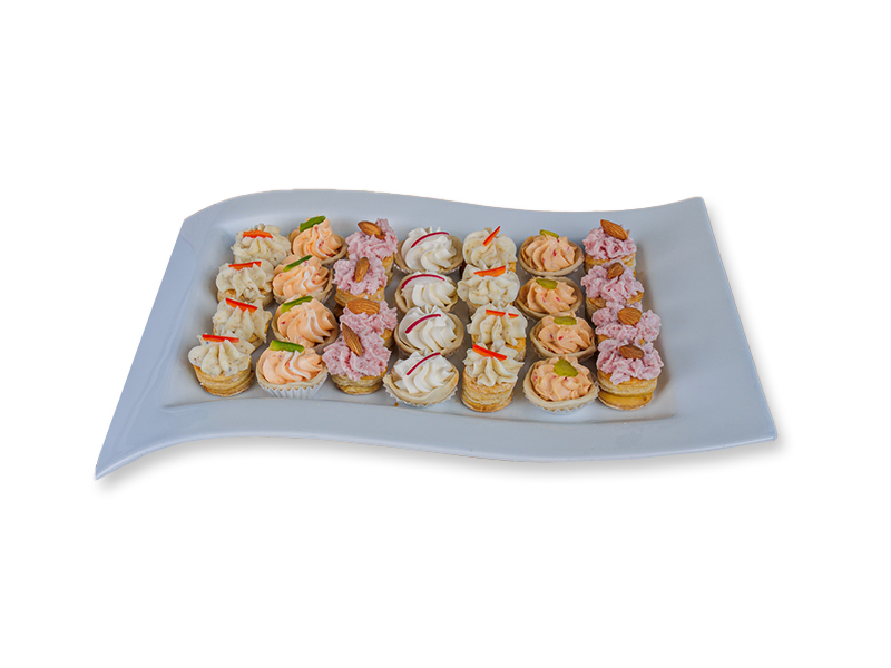 Tacitas y voulevant, rellenas con mezcla de queso salmon, champiñon, salame, jamón y queso azul . Se recomienda calentar antes de servir.