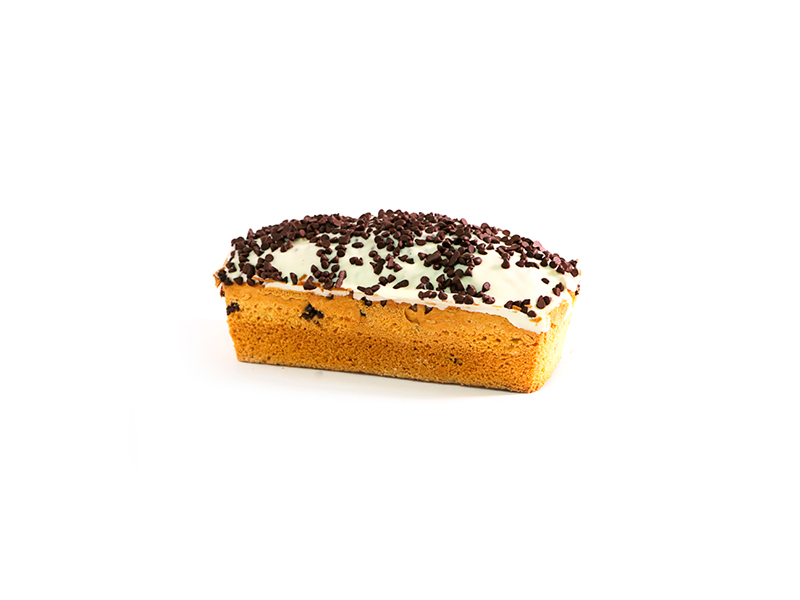Queque sabor chocolate con chips de chocolate, cubierto de chocolate blanco.