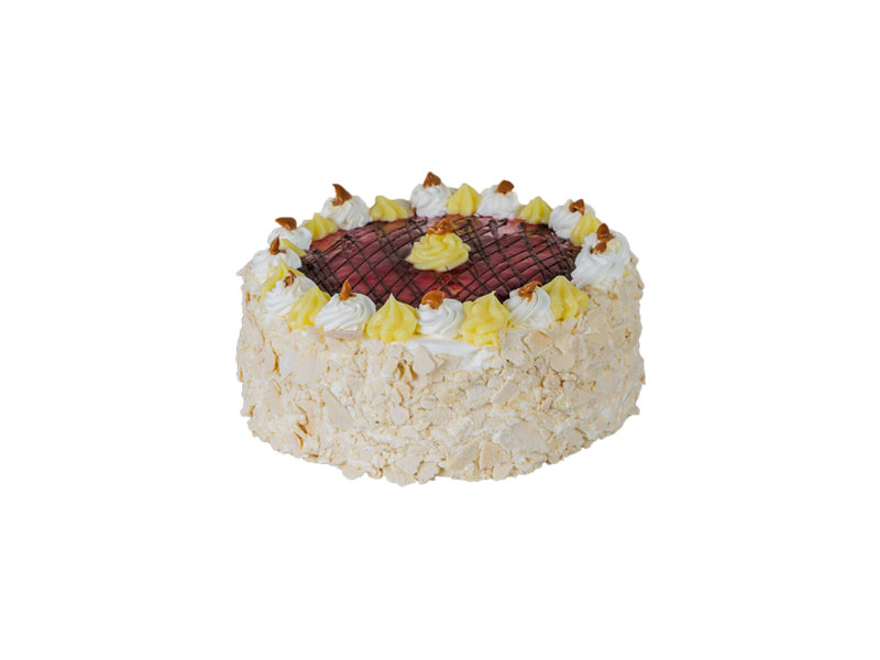 Hojarasca fina, crema pastelera, manjar y crema chantilly mezclada con frambuesa natural. Cubierta en crema con aplicación de mermelada.