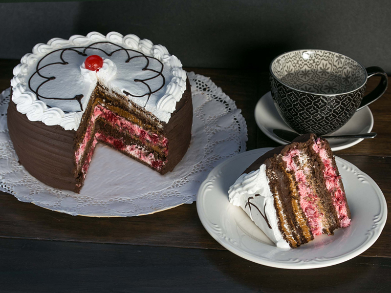 Bizcocho fino de chocolate, ganache y chips de chocolate, manjar, frambuesa natural y crema chantilly. Cubierta en ganache de chocolate y merengue.