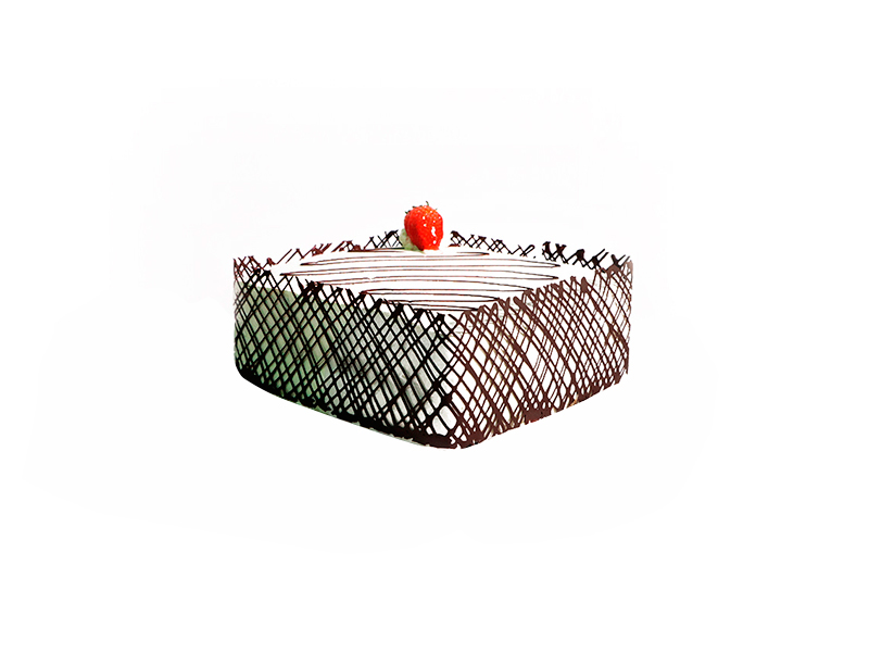 Bizcocho brownie (chocolate y nuez), mermelada de guinda y crema chantilly. Decorada con crema chantilly y aplicación de chocolate.
