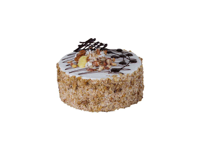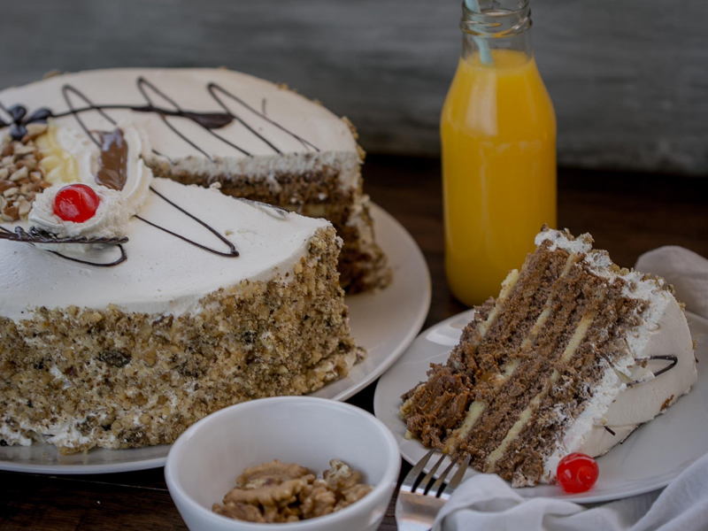 Bizcocho de chocolate, manjar, nueces molidas y crema pastelera. Cubierta en crema chantilly.