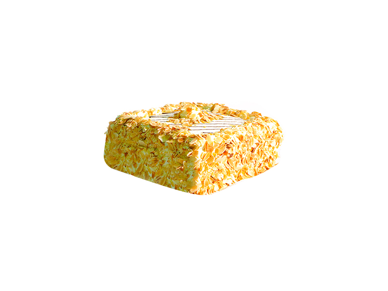 Bizcocho blanco, crema mousselina, licor (whisky y amareto) almendras laminadas. Cubierta en crema mousselina y almendras.