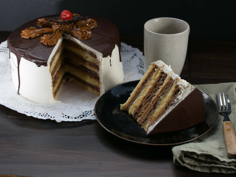 Bizcocho blanco y chocolate, manjar, mermelada de frambuesa y crema pastelera. Cubierta con crema chantilly y cobertura de chocolate.