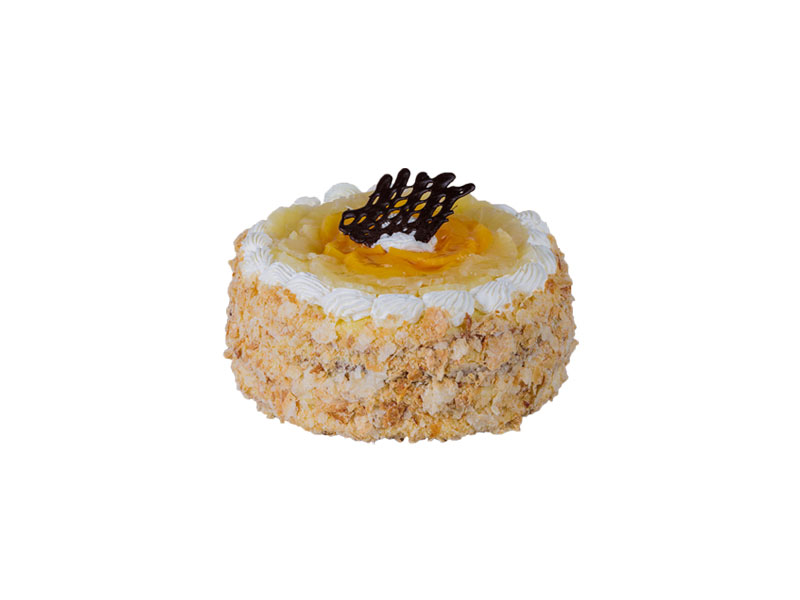 Bizcocho blanco y de chocolate, crema pastelera, mermelada de frutilla y trocitos de piña y durazno. Cubierta en crema pastelera, mil hojas y frutas de la estación.