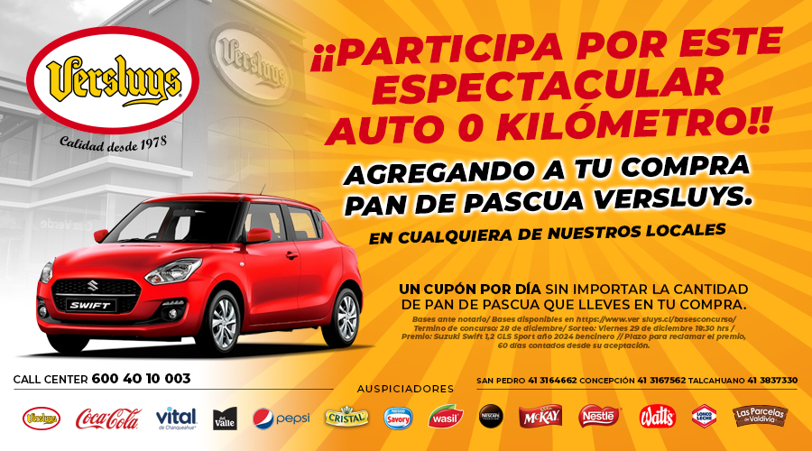 Participa en el sorteo de un espectacular auto Suzuki Swift 2024 cero kilómetro, agregando a tu compra Pan de Pascua Versluys en cualquiera de sus locales. Revisa las bases en www.versluys.cl.